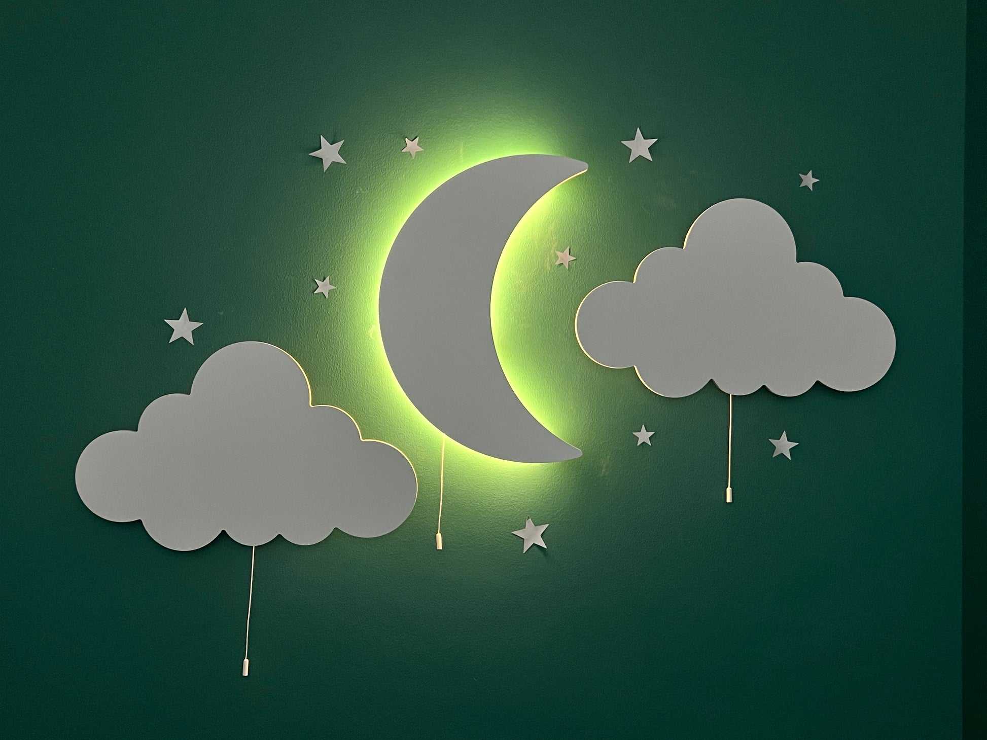 Set Of 3 Wall Lights (1 Crescent & 2 Cloud), Nursery Room Lighting